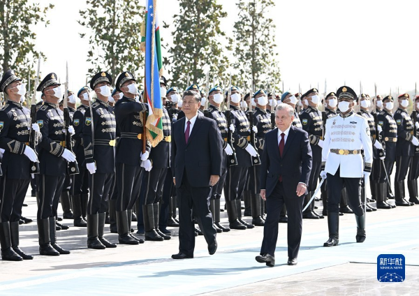 当地时间9月15日,国家主席习近平在撒马尔罕同乌兹别克斯坦总统米尔济约耶夫会谈。会谈前,米尔济约耶夫为习近平举行隆重欢迎仪式。新华社记者 申宏 摄