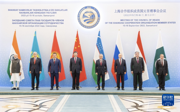 当地时间9月16日,国家主席习近平在撒马尔罕国际会议中心出席上海合作组织成员国元首理事会第二十二次会议小范围会谈。这是小范围会谈前,上海合作组织成员国领导人集体合影。新华社记者 李涛 摄
