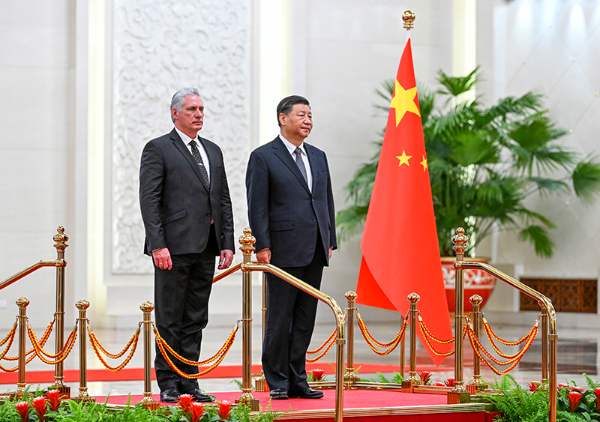 会谈前,习近平在人民大会堂北大厅为迪亚斯-卡内尔举行欢迎仪式,天安门广场鸣放21响礼炮,两国元首登上检阅台,检阅中国人民解放军仪仗队。