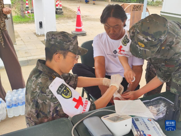 8月7日,武警河北总队医院在涿州范阳东路与腾飞大街开设便民医疗点,为受灾群众治疗脚伤。新华社发(杨雪乾 摄)