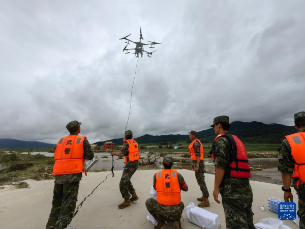 武警吉林总队吉林支队官兵利用无人机向舒兰市开原镇五滴村小乡屯90余名被洪水围困的群众空投食品和饮用水(8月6日摄)。新华社发(曹孟泽 摄)