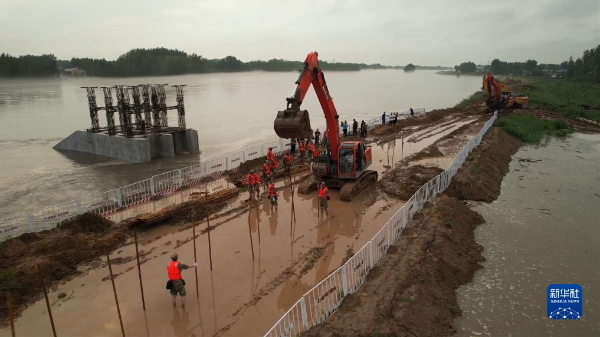 陆军第82集团军某勤务旅官兵在河北涿州市东茨村大桥进行巡堤筑坝任务(8月2日摄)。新华社发(邓青华 摄)