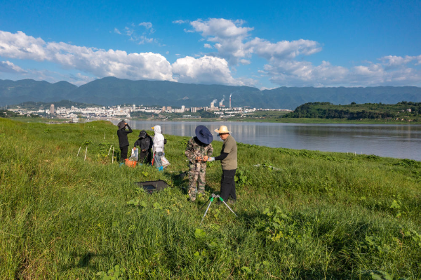 在位于重庆的中国科学院三峡库区水土保持与环境研究站,中国科学院成都山地所科研人员在库区消落带上开展相关监测(2023年7月5日摄,无人机照片)。