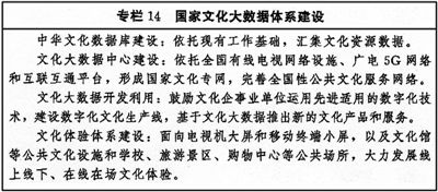 加强规划引导和政策指导,打通各层级公共文化数字平台,打造公共文化数字资源库群,建设国家文化大数据体系。统筹推进公共文化数字化重点工程建设,把服务城乡基层特别是农村作为着力点,不断缩小城乡之间的数字鸿沟。建设智慧图书馆体系和国家公共文化云,建设智慧博物馆,打造智慧广电、电影数字节目管理等信息数字化服务平台。积极发展云展览、云阅读、云视听、云体验,促进供需在“云端”、“指尖”对接。推进农家书屋数字化建设,建立智能化管理体系。(见专栏14)