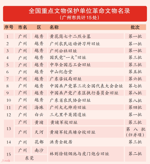 广州市高度重视红色革命遗址保护利用工作,认真落实中央《关于实施革命文物保护利用工程(2018-2022年)的意见》精神,组织开展革命文物名录核定公布工作。此次公布的214处不可移动革命文物和8812件/套可移动革命文物,包括15处全国重点文物保护单位革命文物、11处广东省文物保护单位革命文物以及69处广州市文物保护单位革命文物。三分之一的不可移动革命文物集中在越秀区,其他均匀分布全市各区。这些革命文物跨越1840年鸦片战争爆发到新中国成立百年历史长河,既有烈士墓、陵园、纪念碑、故居、旧址、纪念堂等,也有票据、手稿、书籍、刊物、武器、纪念章、历史照片、生活用品等类型。它们见证了近代以来广州人民抵御外来侵略、维护国家主权、捍卫民族独立和争取人民自由的英勇斗争,见证了中国共产党领导中国人民进行新民主主义革命和社会主义革命、建设与改革的历史,勾勒出近代以来广州波澜壮阔的革命历史画卷,体现了广州作为近代革命策源地的特殊地位。此次发布的爱国主义教育基地,其中国家级基地6个、省级30个,这些基地许多展览既展示了革命岁月峥嵘历程,也展示了改革开放以来特别是党的十八大以来,广州坚持以习近平新时代中国特色社会主义思想为指导,推动实现老城市新活力,在综合城市功能、城市文化综合实力、现代服务业和现代化国际化营商环境方面不断出新出彩的生动实践。