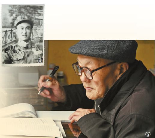 图④:张富清年轻时军装照。图⑤:张富清在家看书学习。